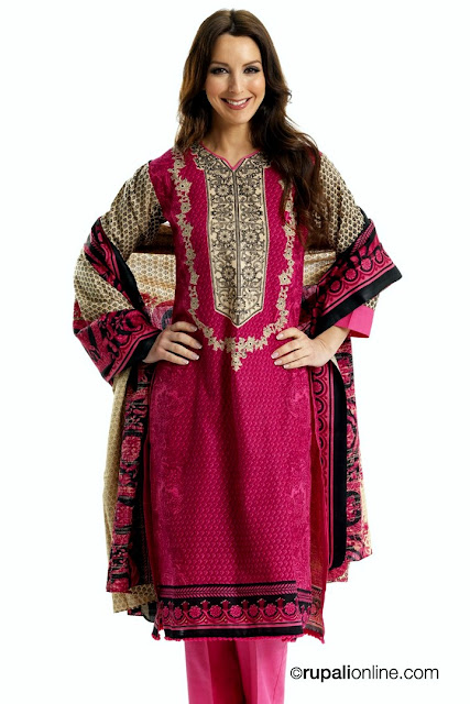 Salwars are made by simple single color matching fabric which is looking good. Similar to salwar dopatta is also being made by simple crinkle fabric, which is good for summer season. This summer you will enjoy the passion of being native after wearing your native dresses elegantly. Hope you will like all the shlwar kameez dresses in this Rupali Online Trouser Suit/Salwar Kameez Collection 2013. Keep visiting she9 for more quality clothing products.